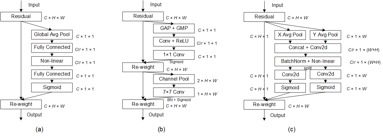 (a) Squeeze-and-Excitation block (b) CBAM (C) Coordinate attention block