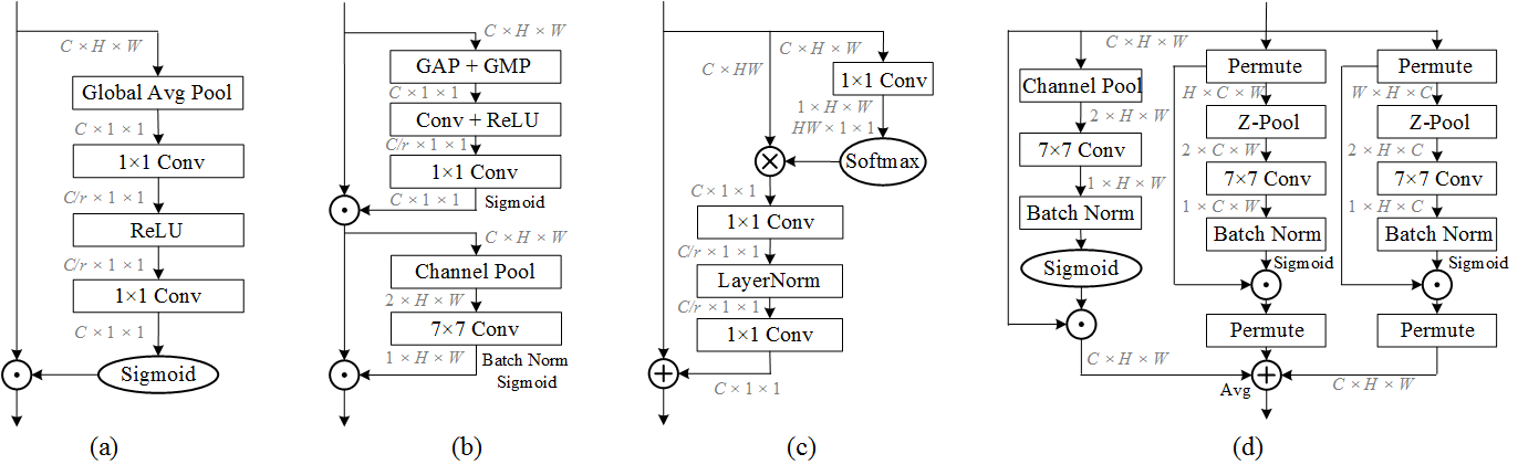 (a). Squeeze Excitation Block. (b). Convolution Block Attention Module (CBAM) . (c). Global Context (GC) block. (d). Triplet Attention